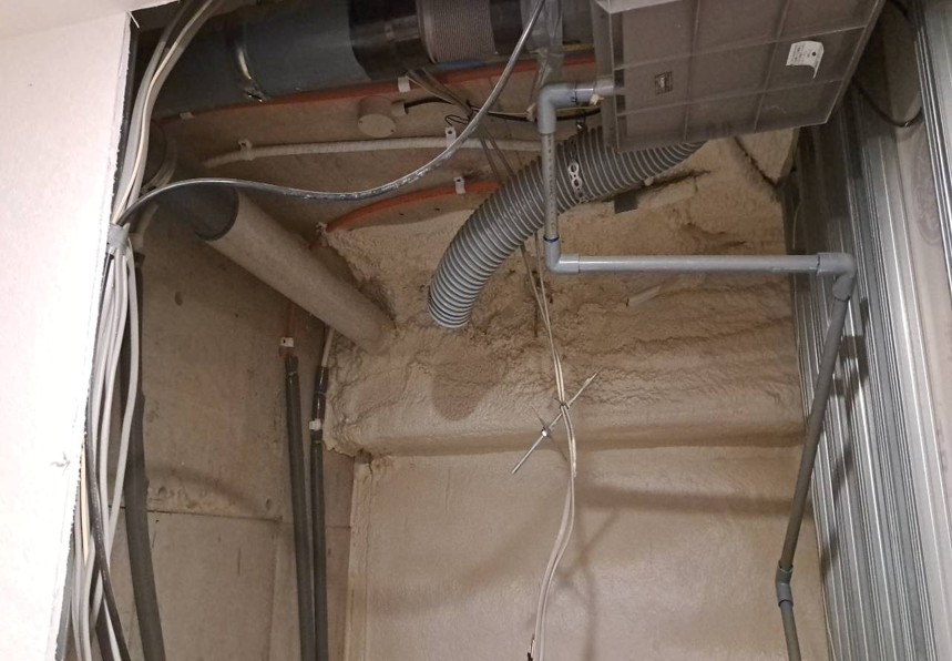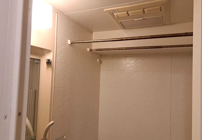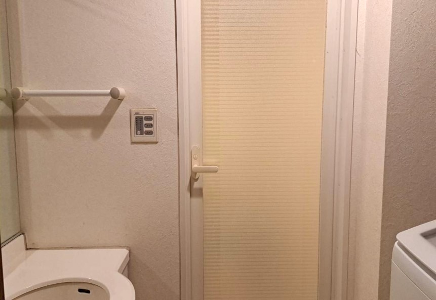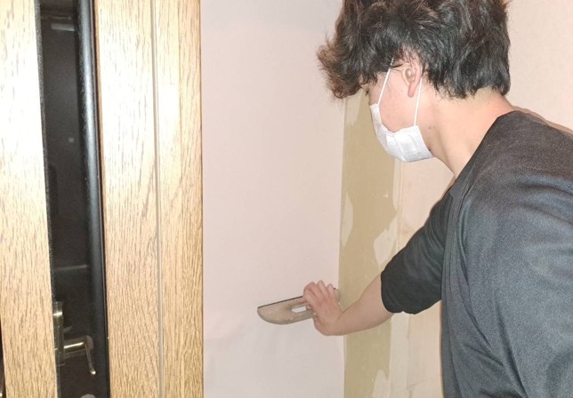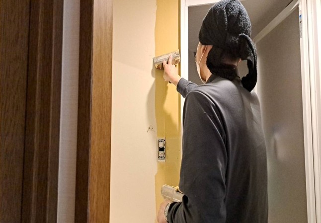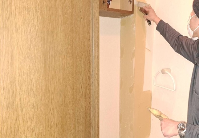 ユニットバス入口周り壁のクロス貼り前の下地処理をしていきます。