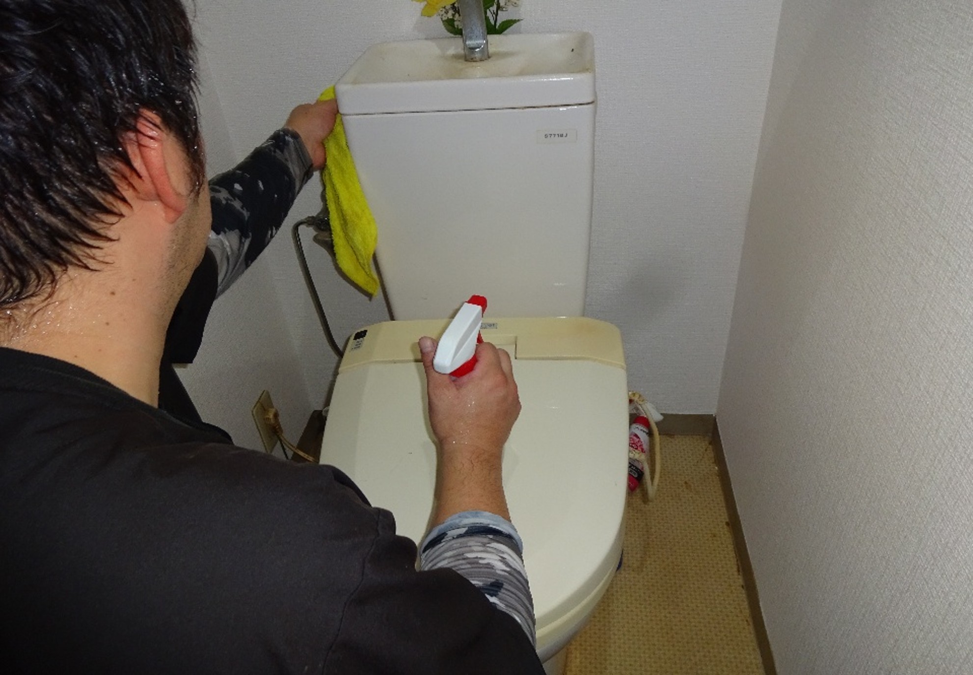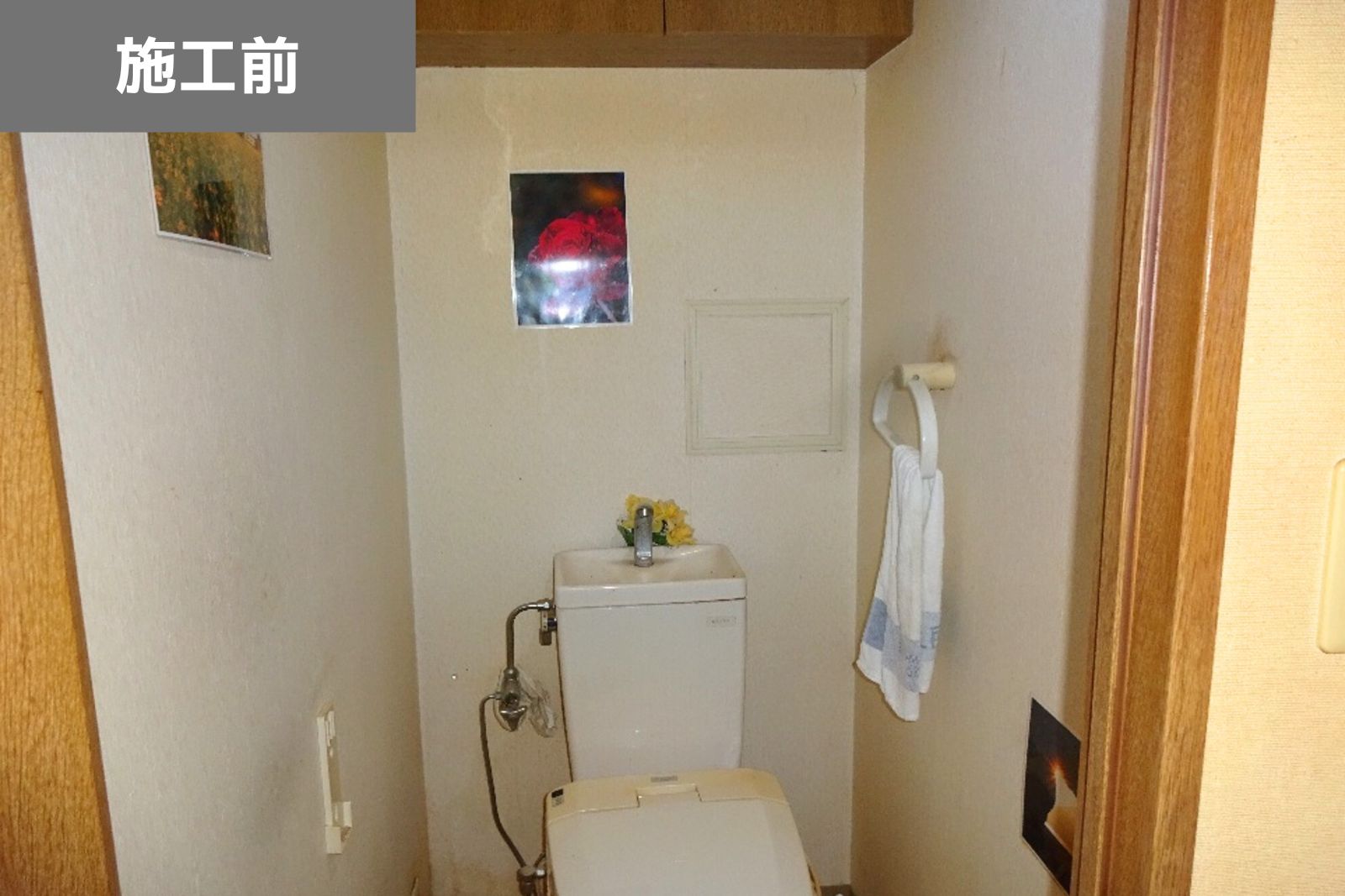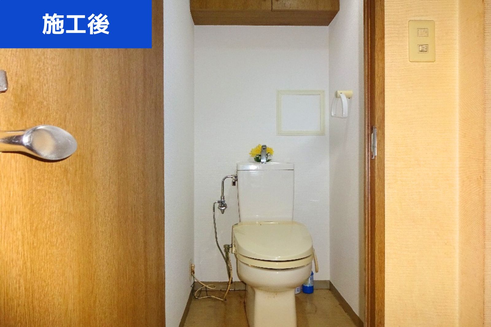 トイレ天井・壁のクロス貼り替えです。クロス貼り替え後、トイレの除菌を行い、完了です。