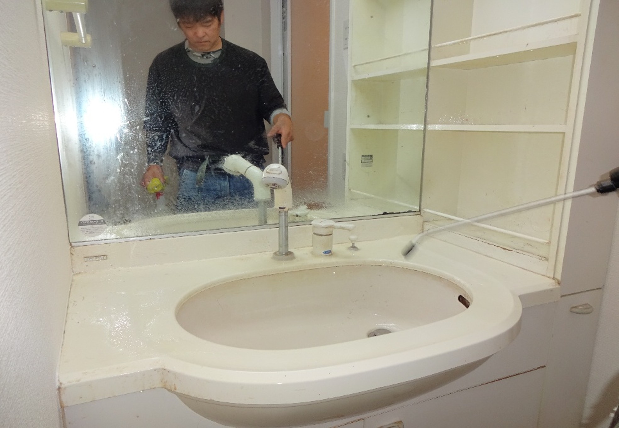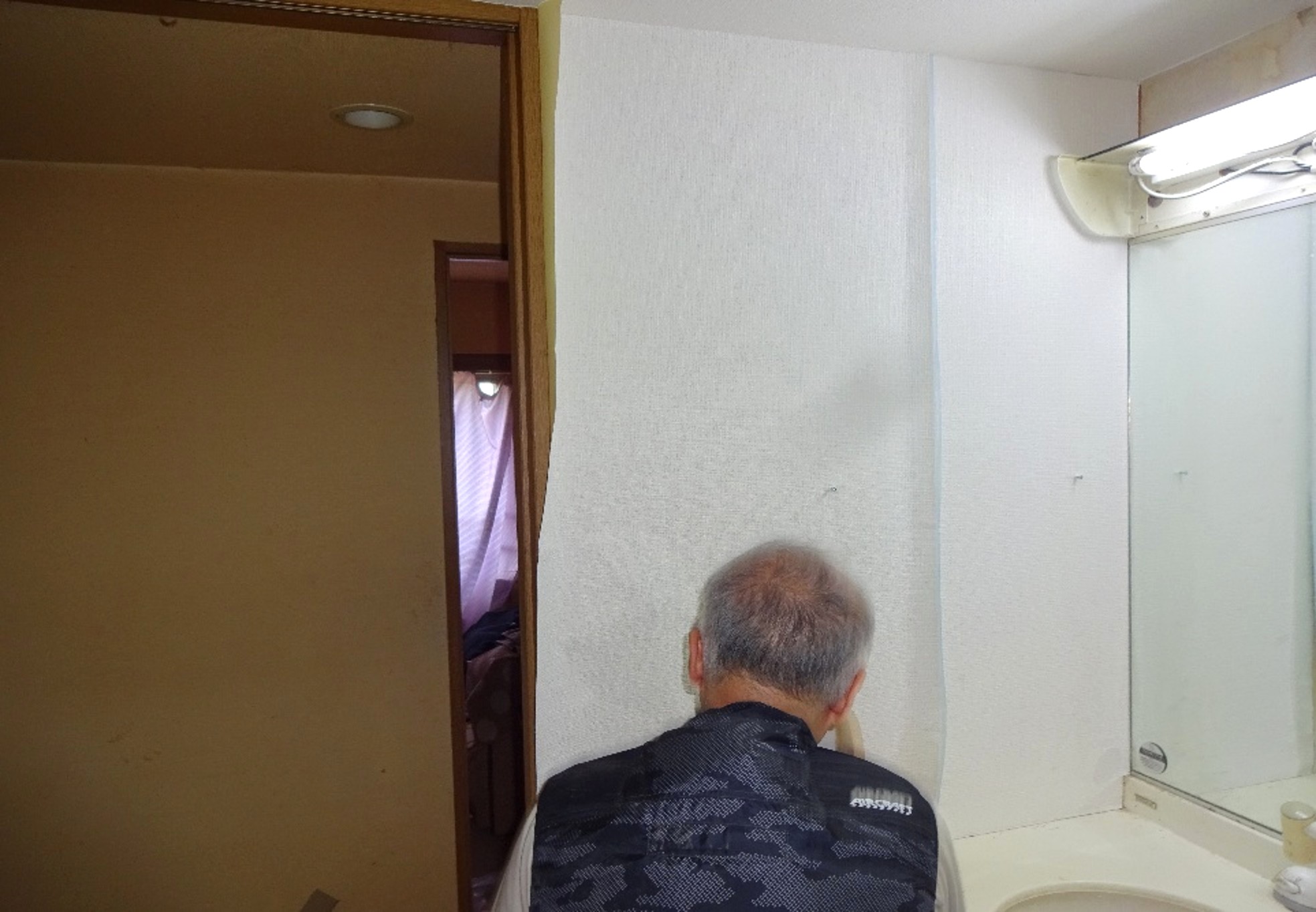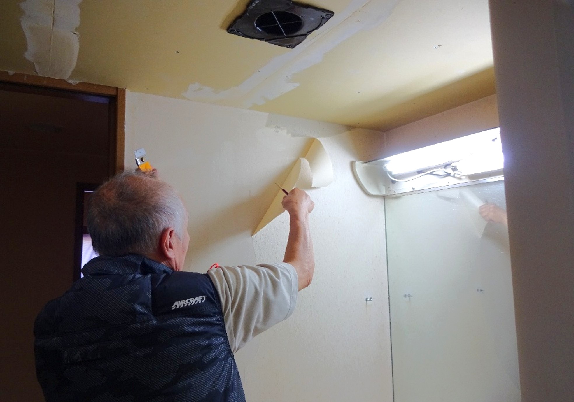 壁のクロス・裏紙を剥がします。天井・壁のクロスを貼り替え、洗面化粧台の除菌作業を行い、完了です。
