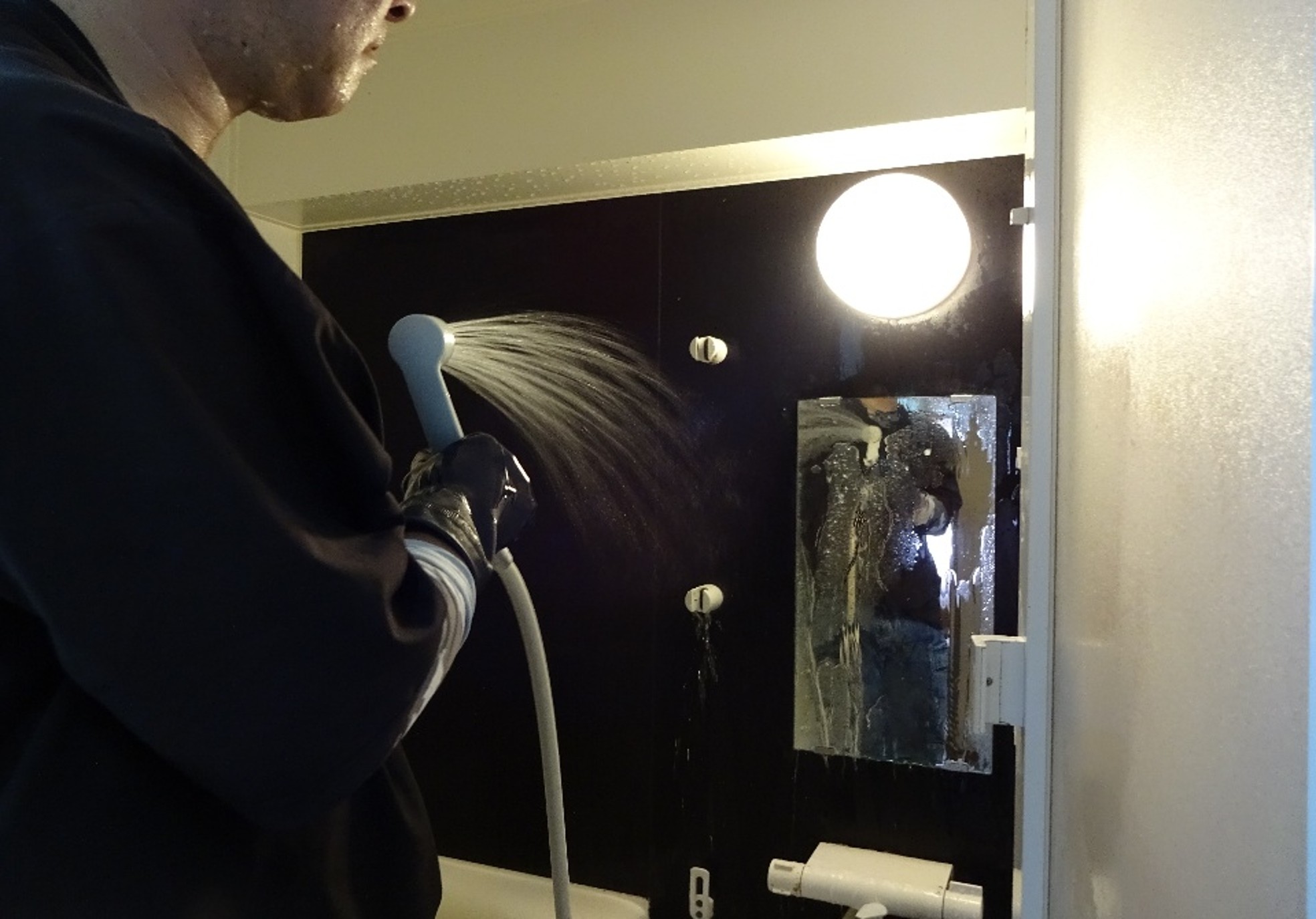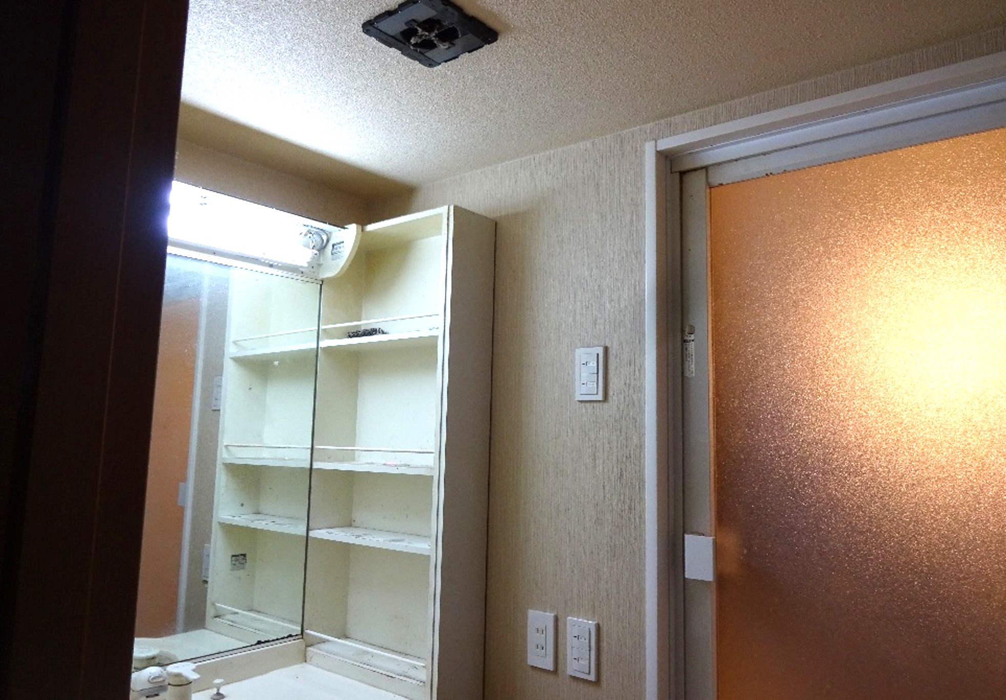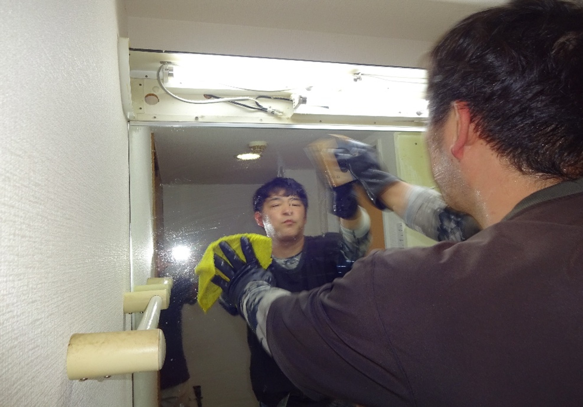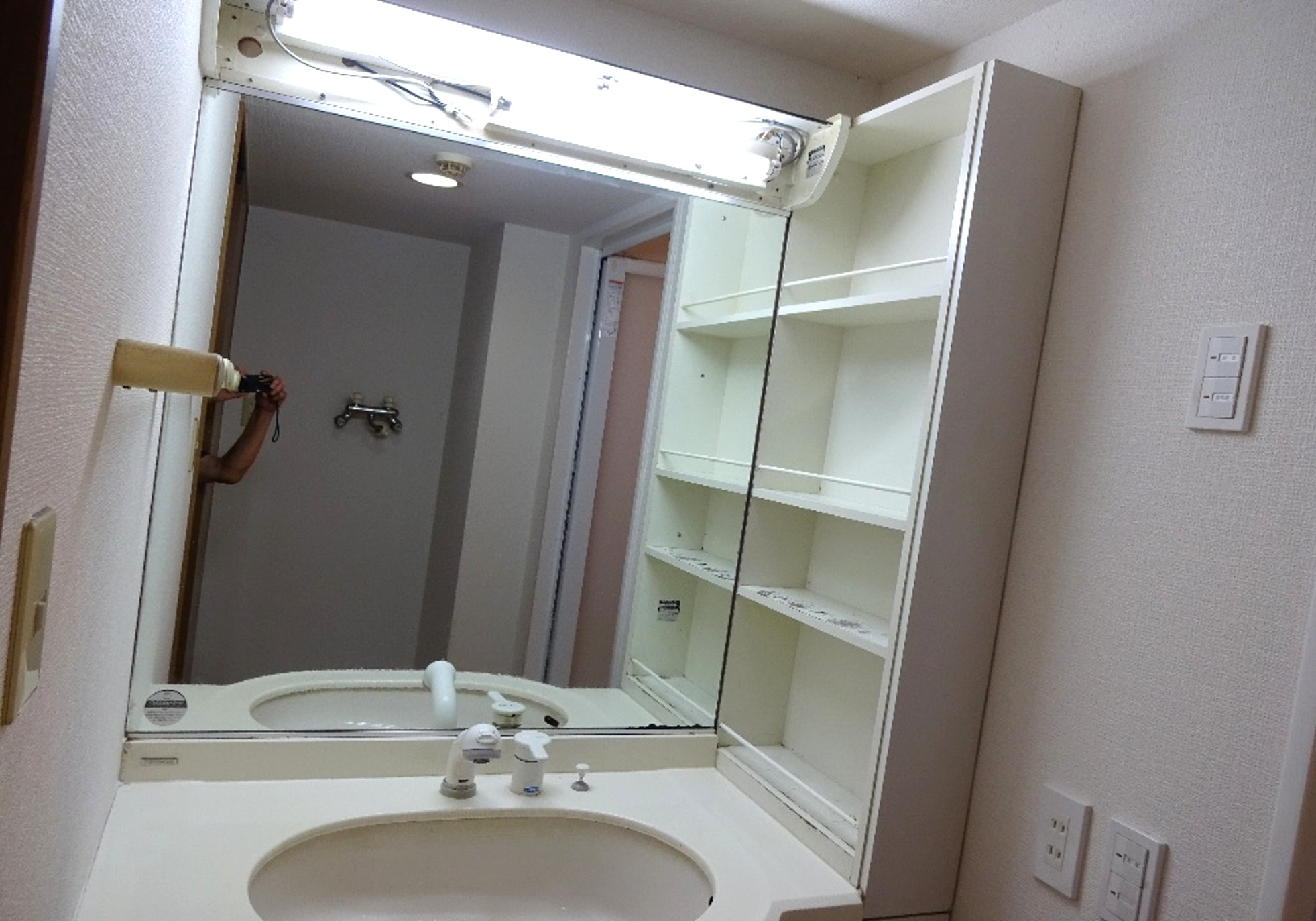 壁のクロス・裏紙を剥がします。天井・壁のクロスを貼り替え、洗面化粧台の除菌作業を行い、完了です。