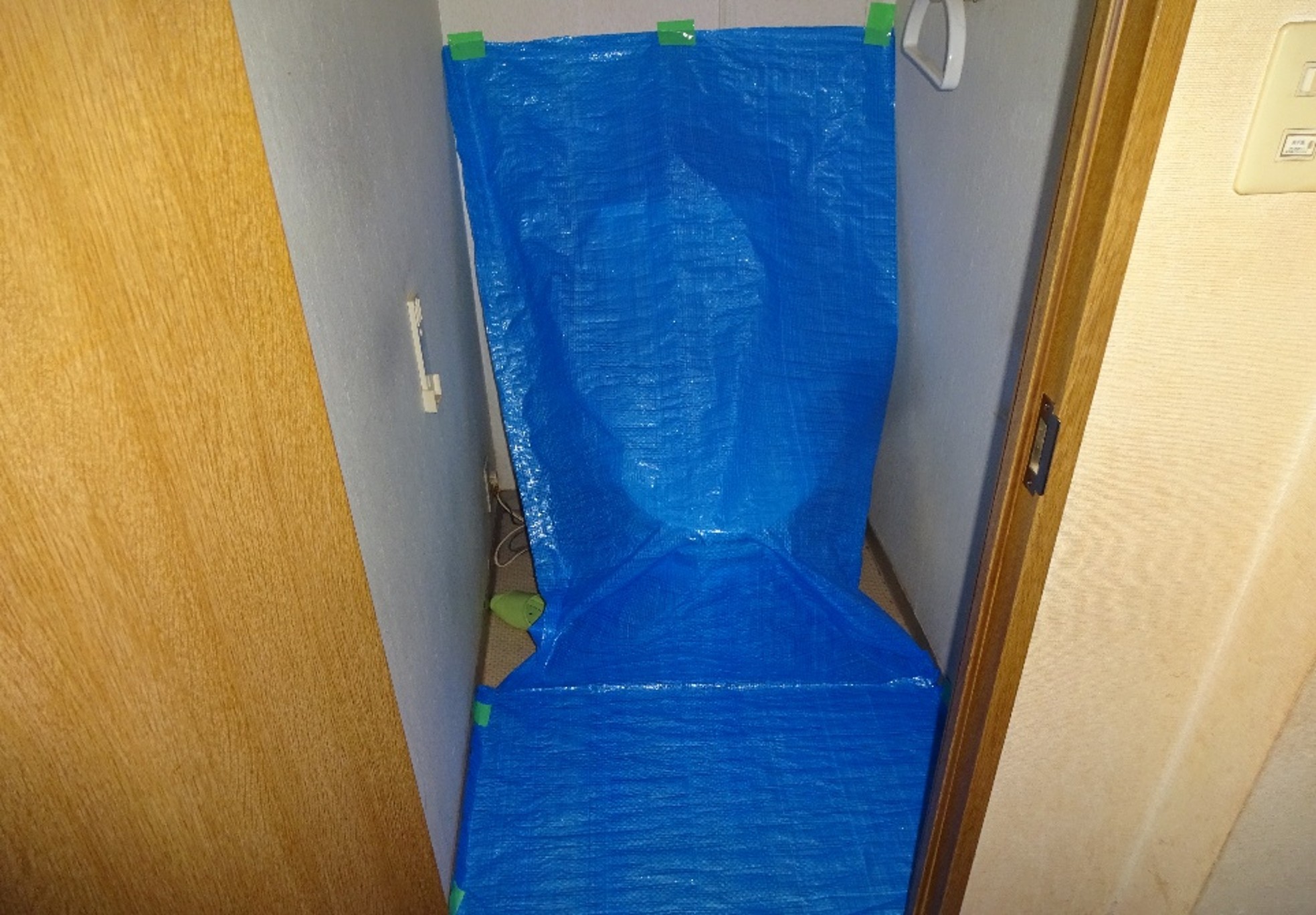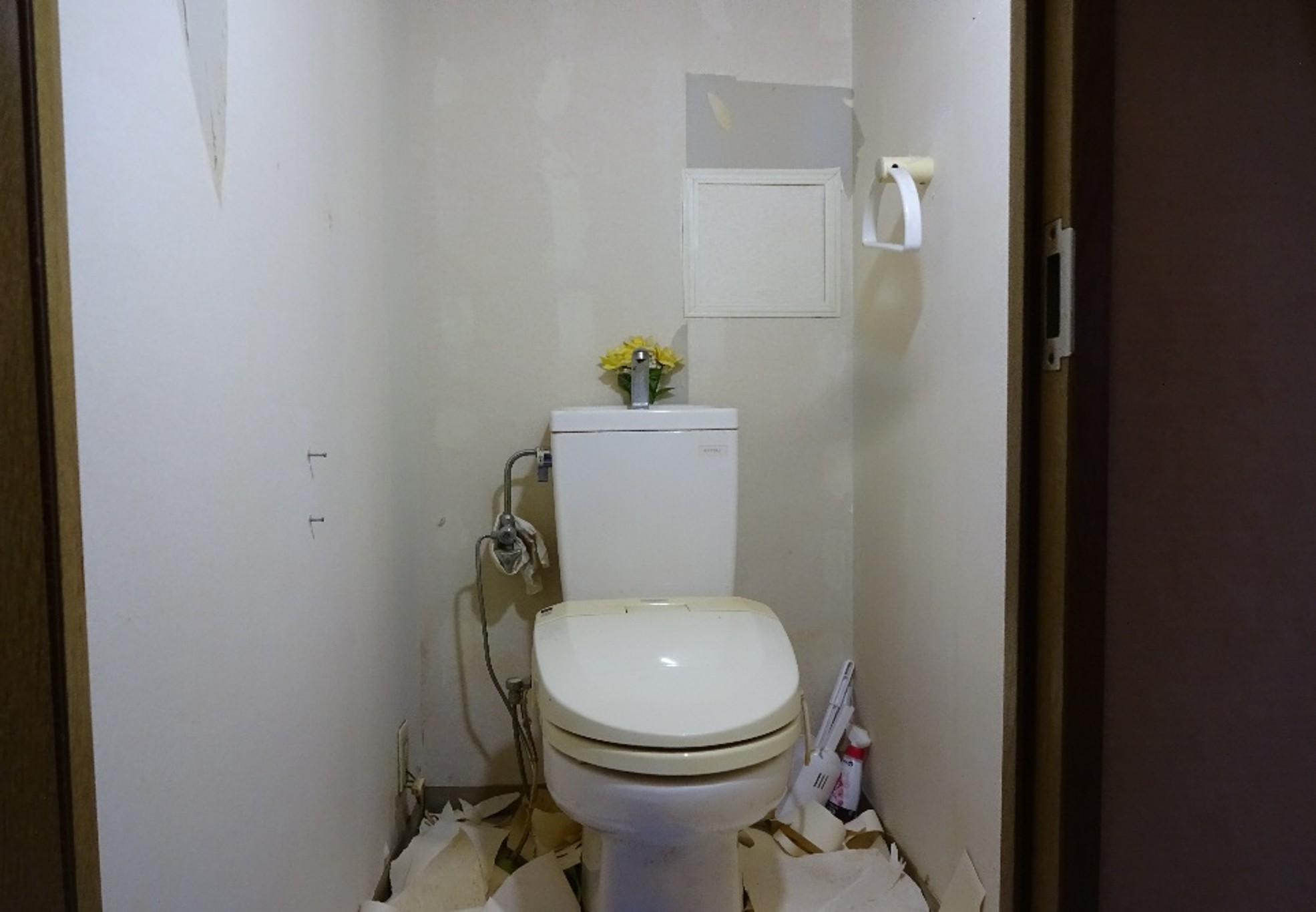 はじめに、トイレ内部の養生をします。天井ボード解体を行い、壁のクロスを剥がしていきます。