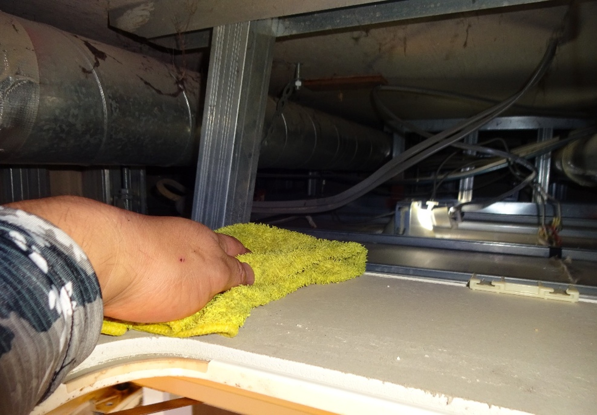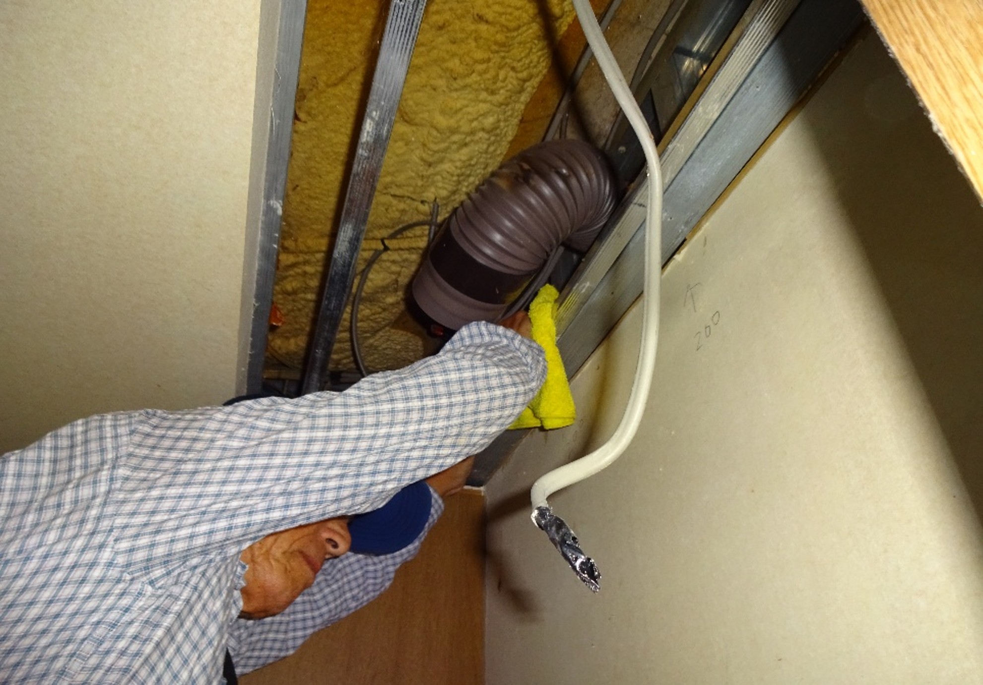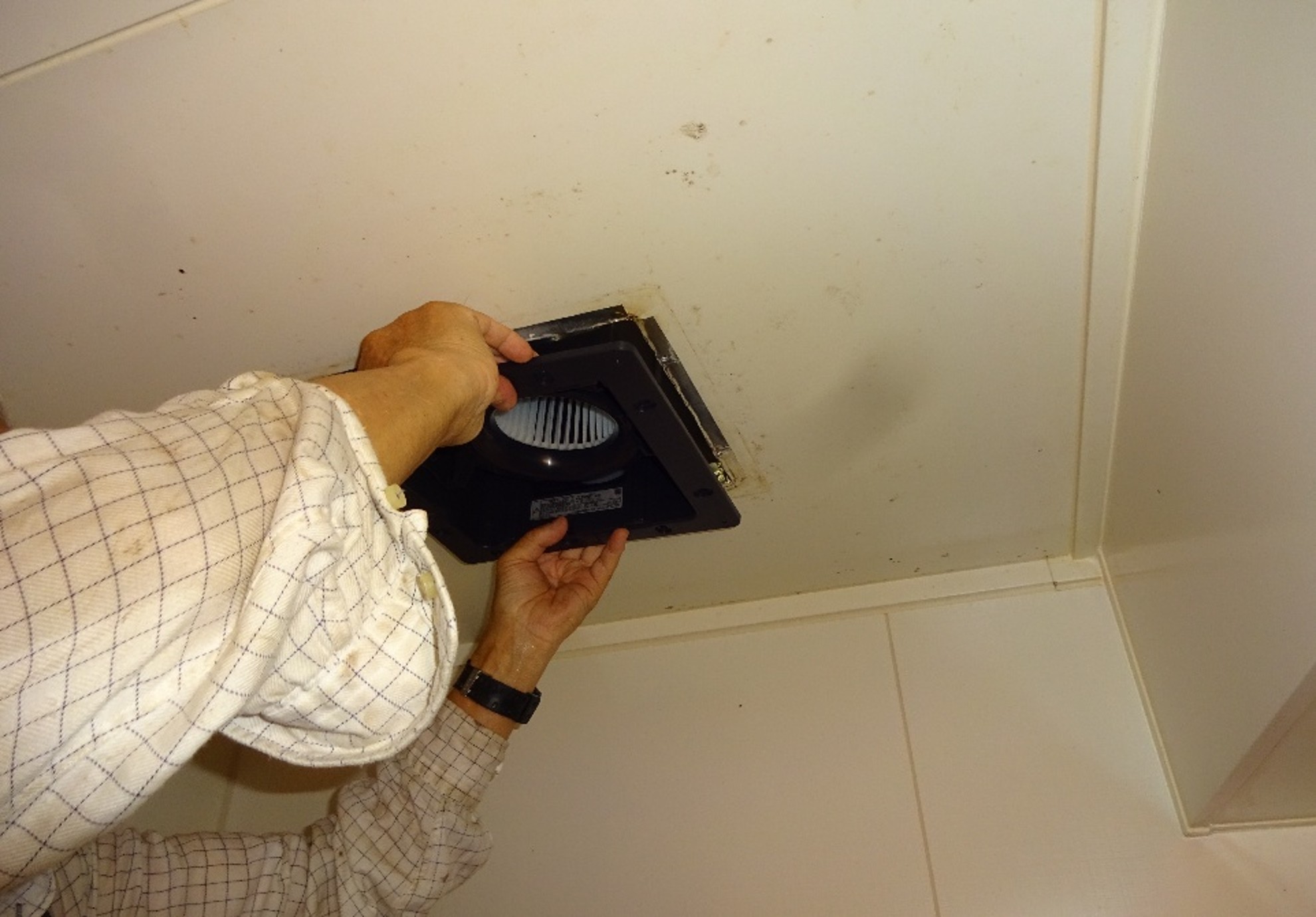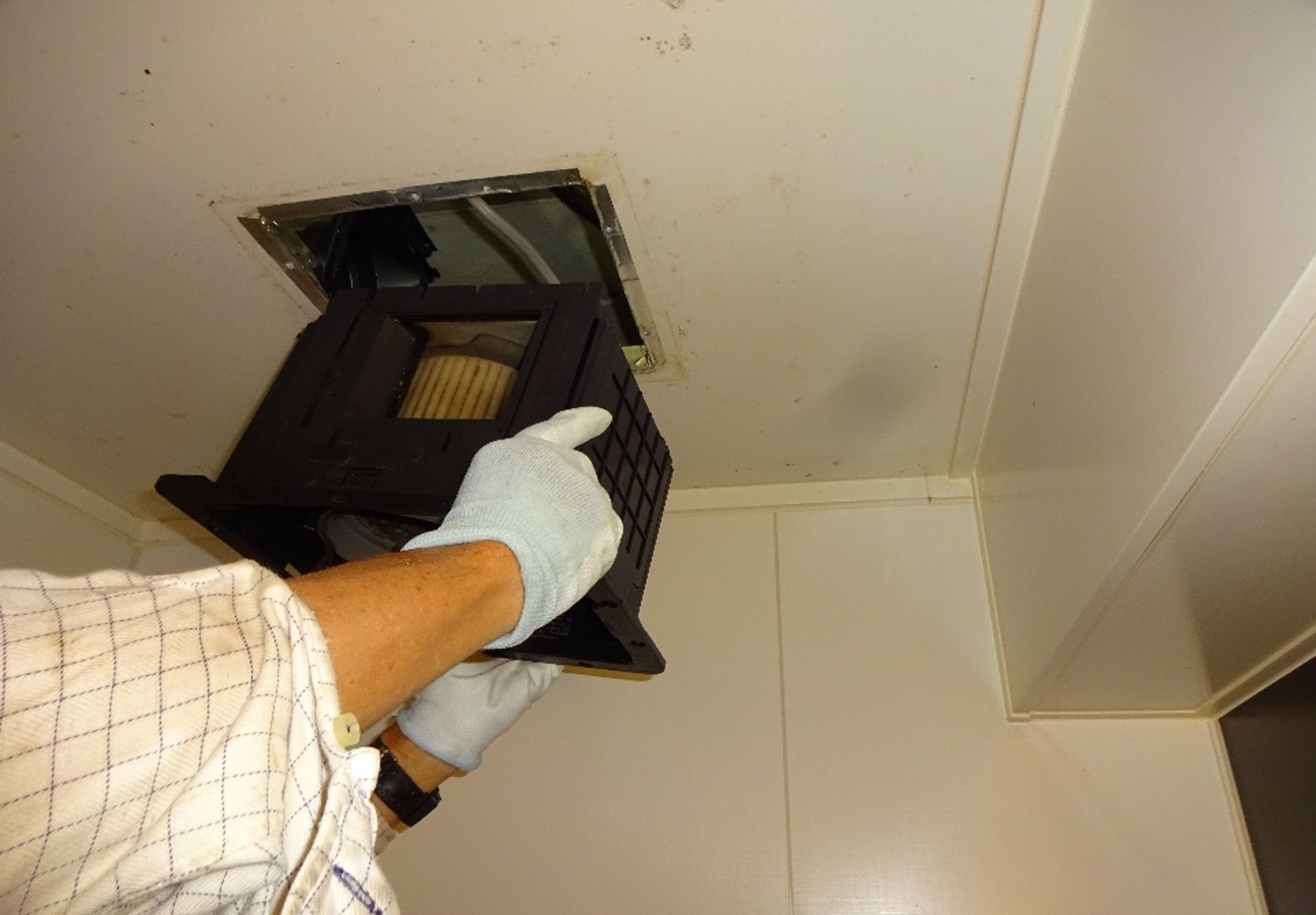 天井パネルの水を拭き取ります。ユニットバス換気扇を取り外し、新しい換気扇に取り替えます。