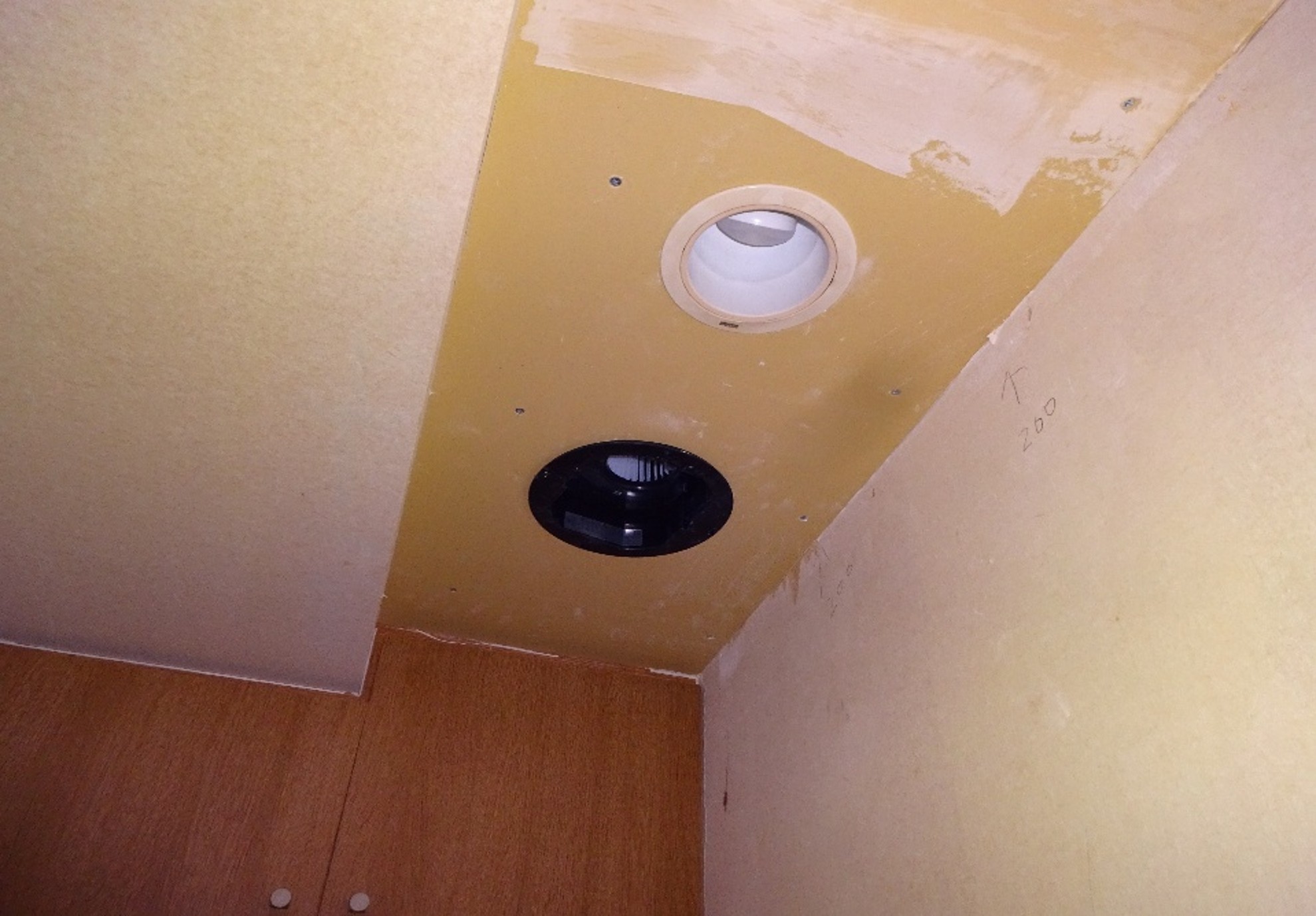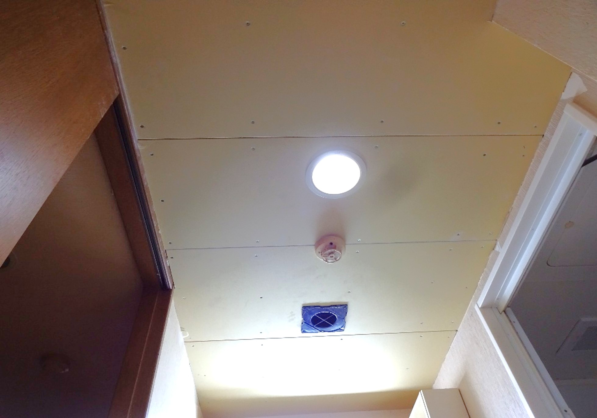 天井ボード解体を行います。換気扇、ダウンライト、火災報知器を取り外します。