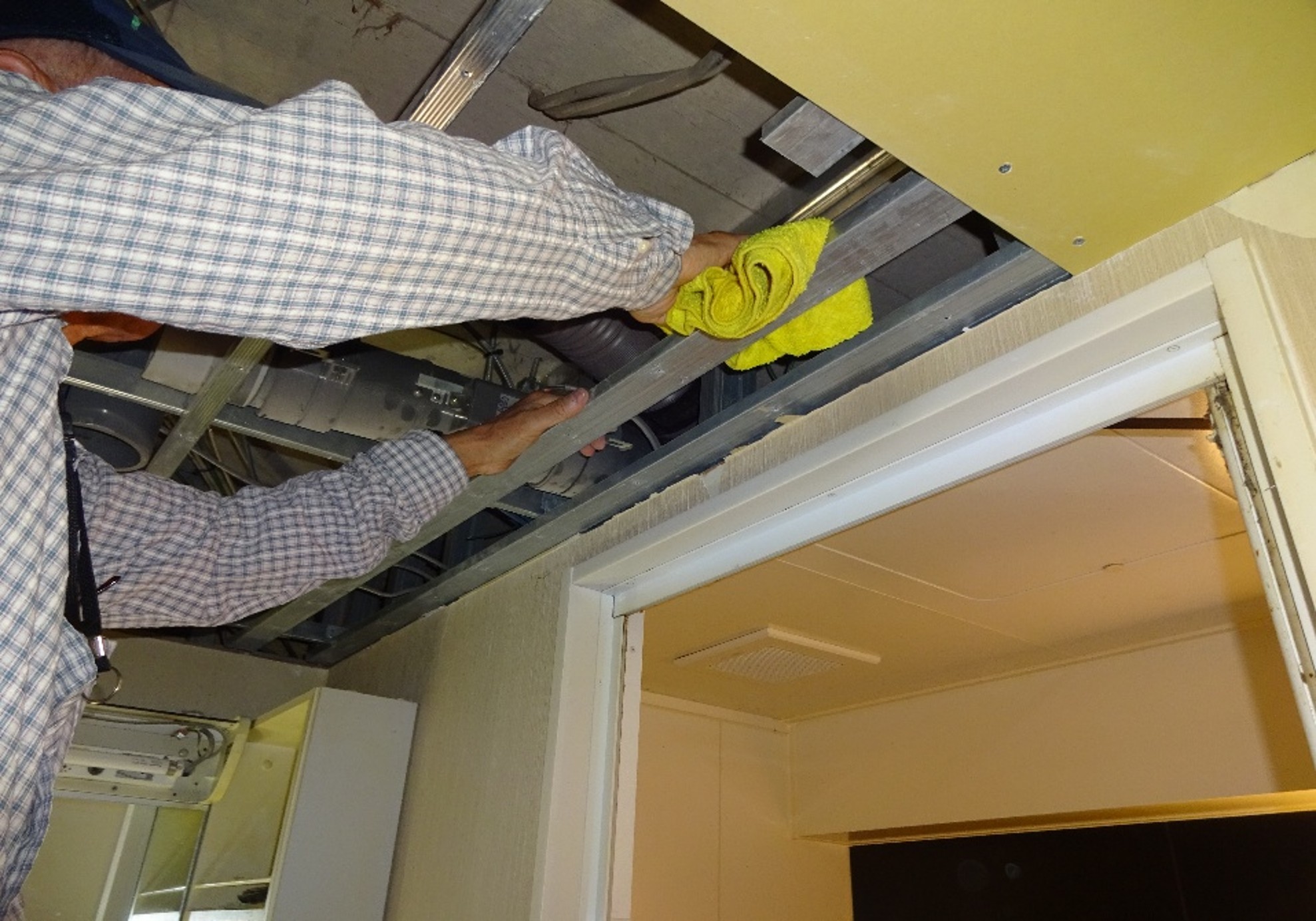 天井下地内の水を拭き取り、天井ボードを貼り替えていきます。