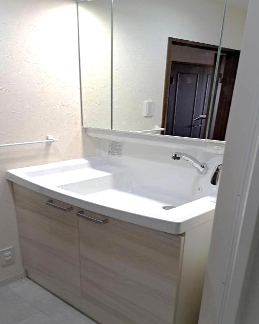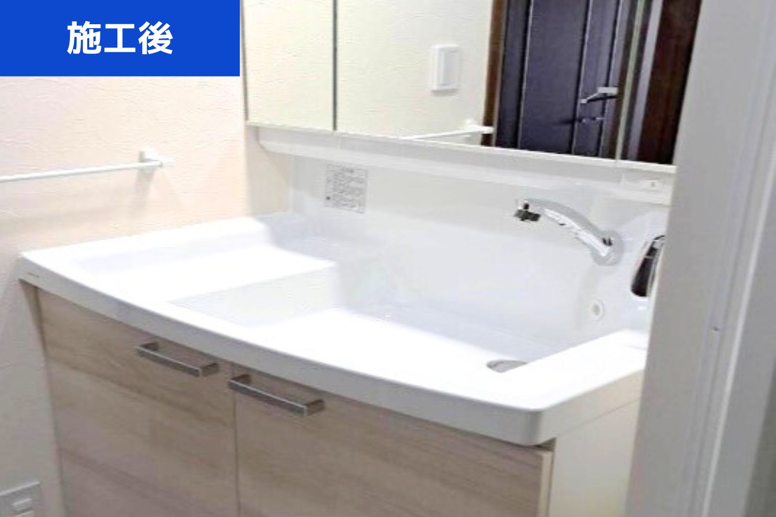 古くなった洗面化粧台を新しいものに交換し、床のクロスも貼り替え、使い勝手と見た目を一気にリフレッシュしました。