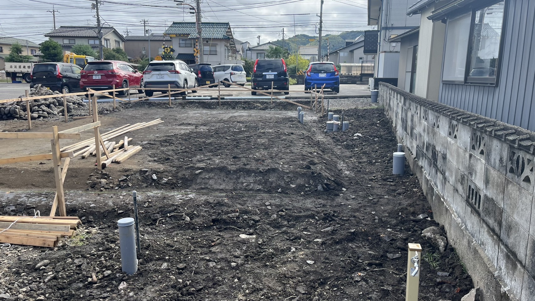 新事務所現場、配管工事が完了し、本日は電気工事ポール立てを行いました!