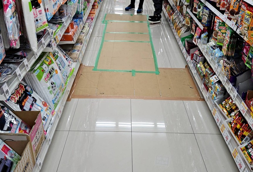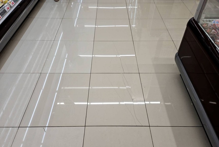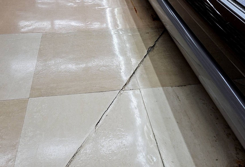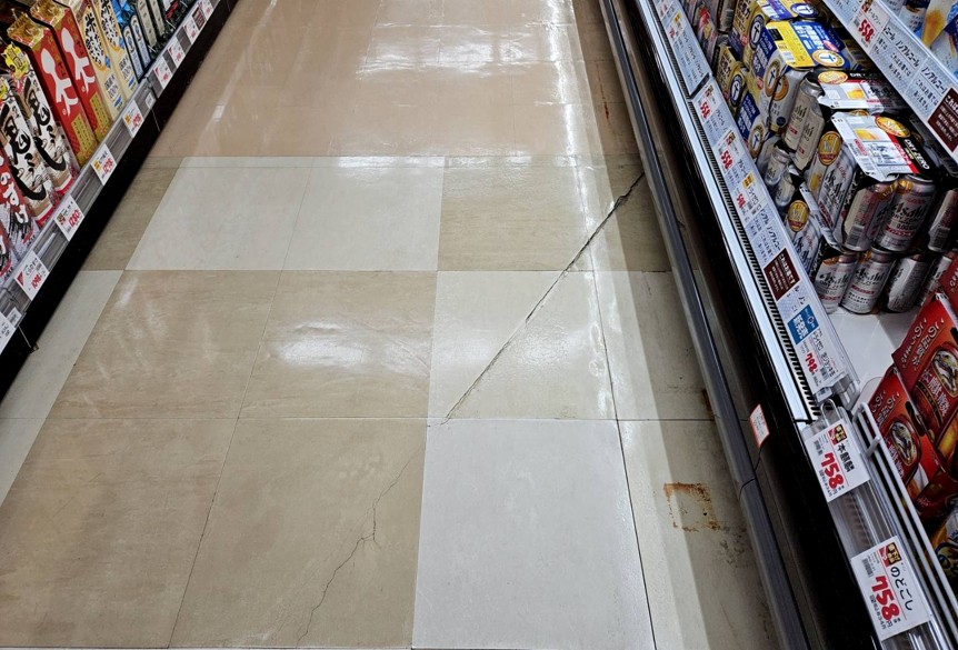 地震の影響で、床にクラックが入り、割れや浮きが確認され、歩行時に違和感が出ている状態でした。